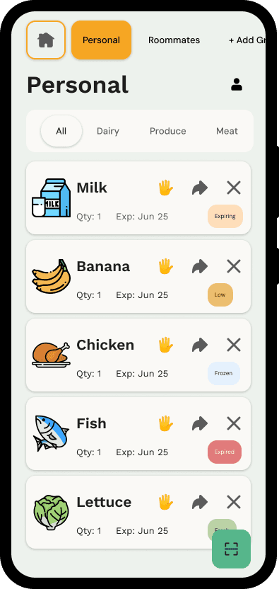 Shared living situations often lead to food waste because groceries are managed collectively but remembered individually. People forget leftovers, lose track of expiration dates, or buy duplicates because there is no simple shared system that fits naturally into everyday life.