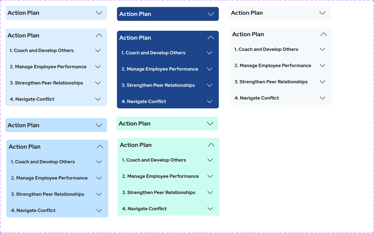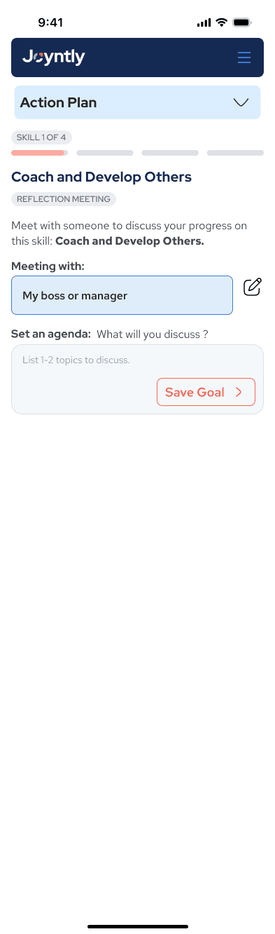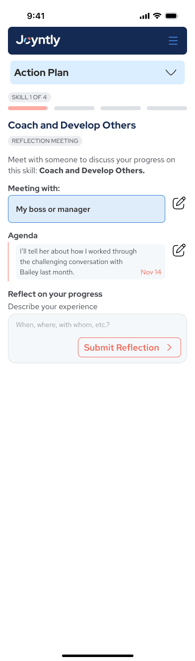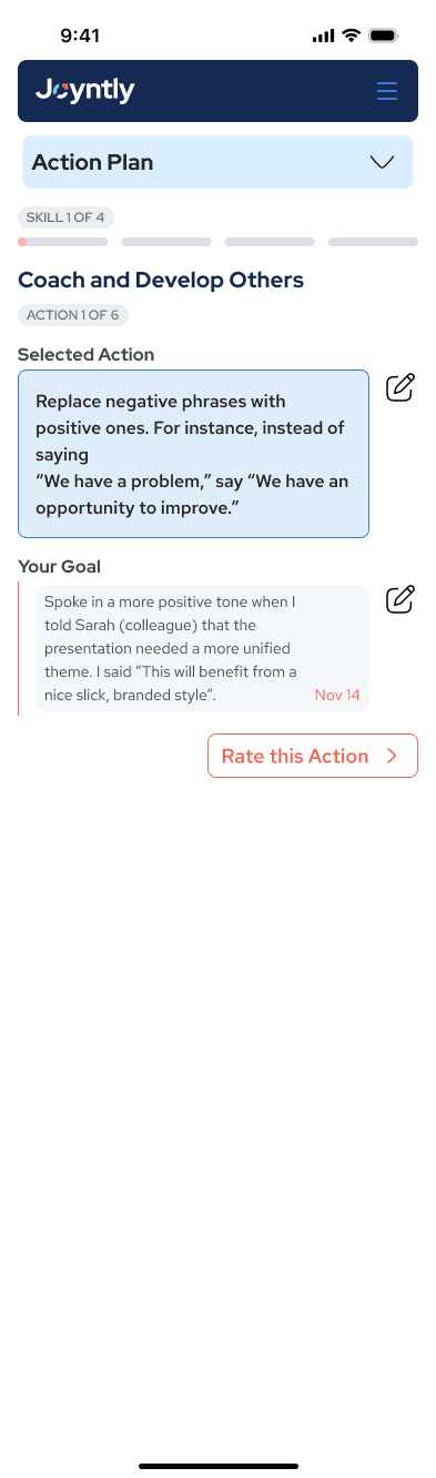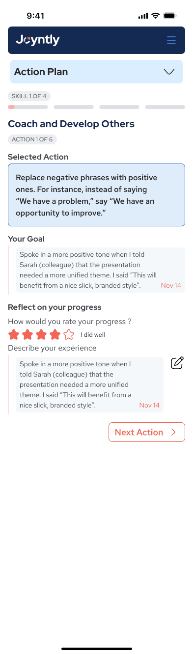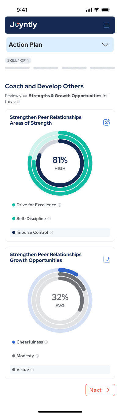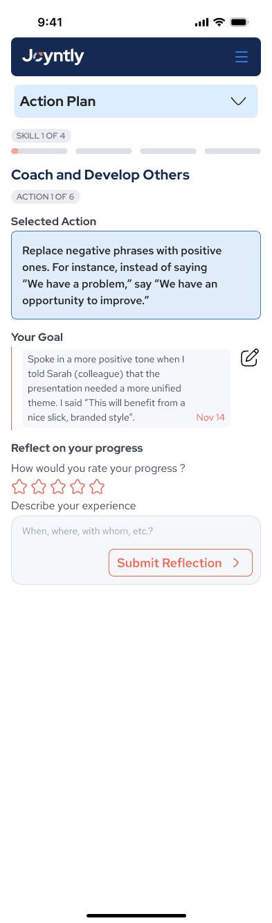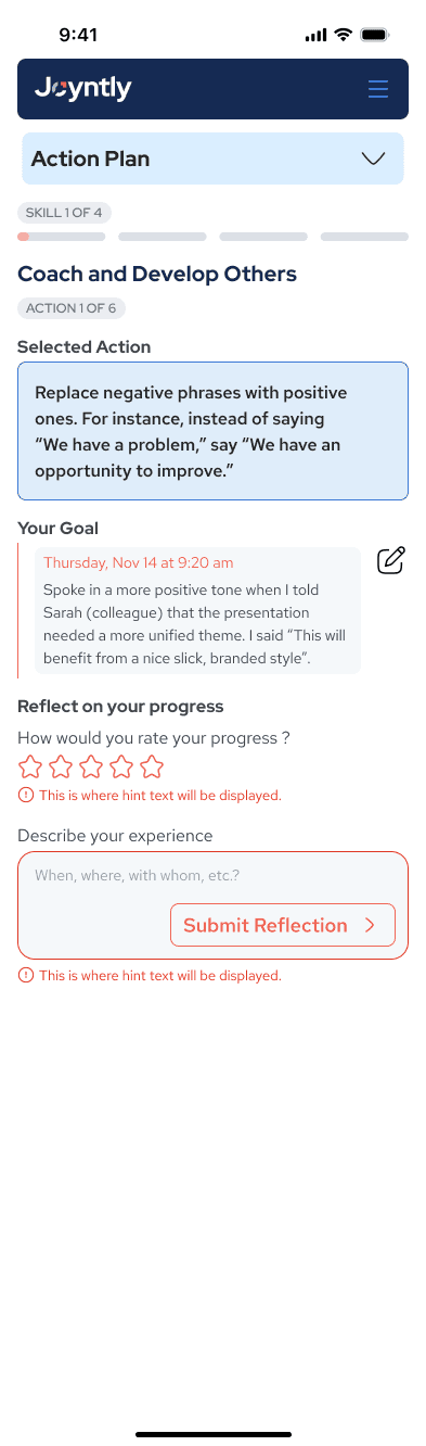 Over the course of this project, I redesigned Joyntly’s post-assessment Action Plan experience from the ground up, rethinking how users move from assessment results into real skill development. The work focused on shifting the experience away from streak-based activity tracking toward a guided, goal-oriented model that supports follow-through in day-to-day work. I led the end-to-end effort, from defining user flows and interaction patterns to building interactive prototypes, identifying usability and accessibility issues, and partnering closely with PMs and engineers to make the redesign build-ready.