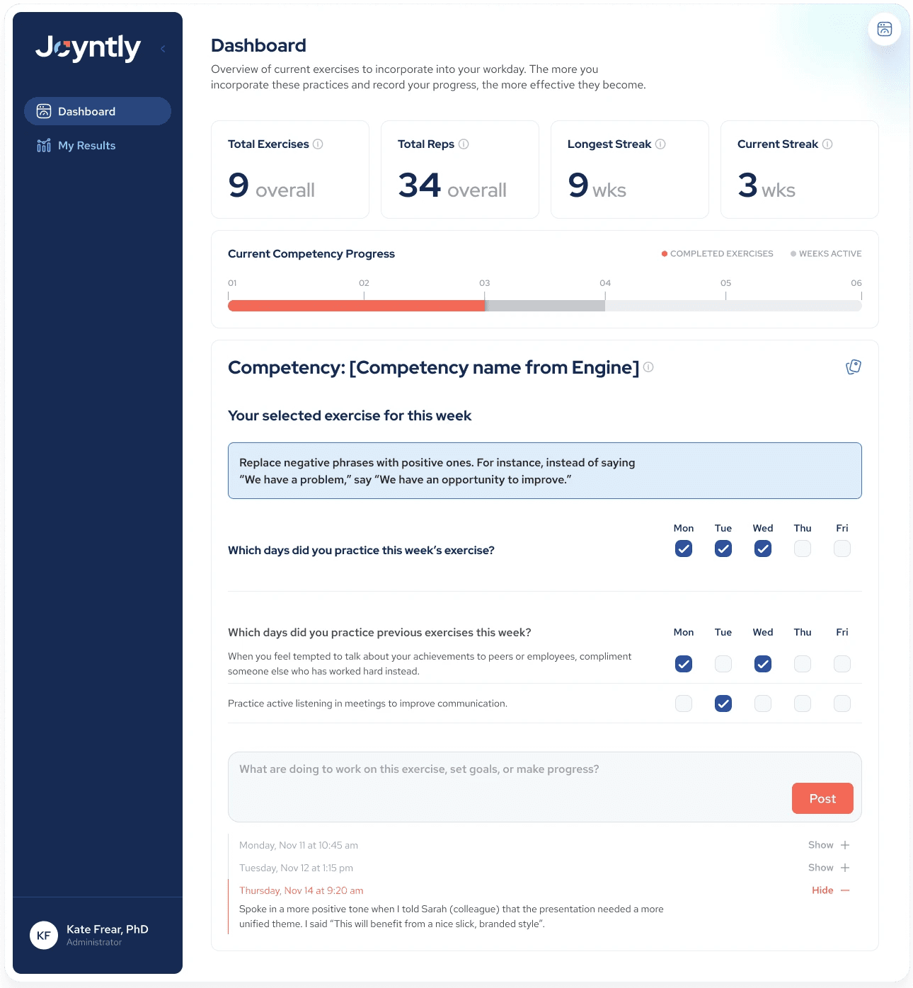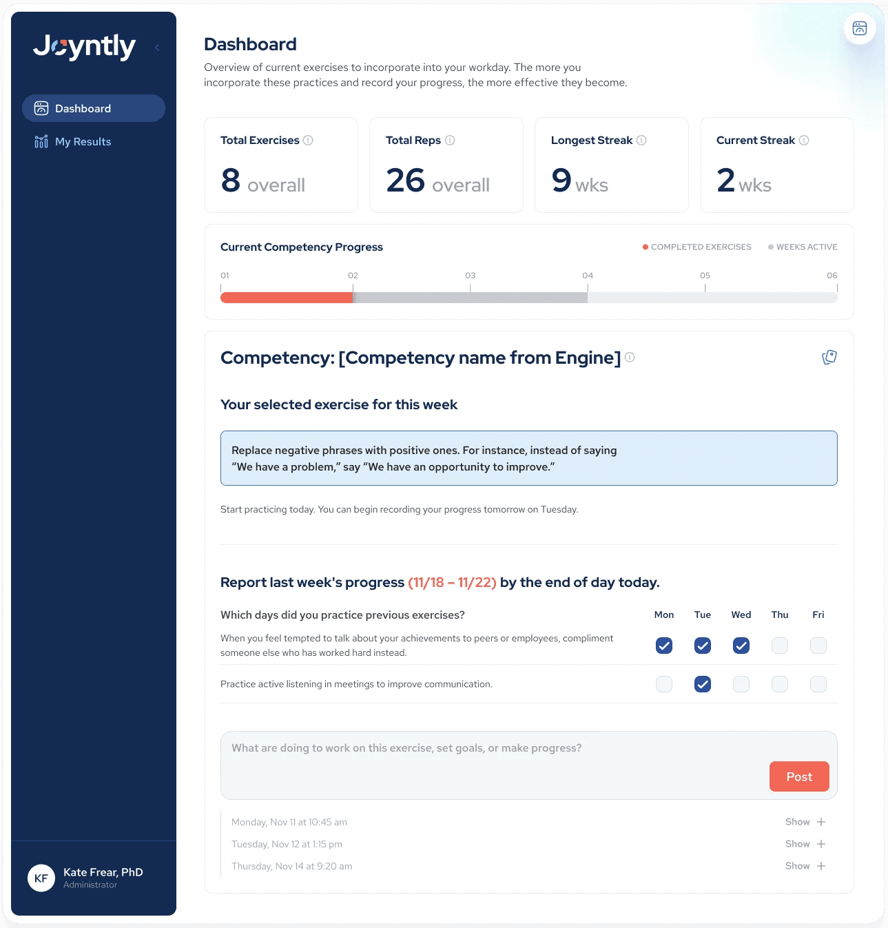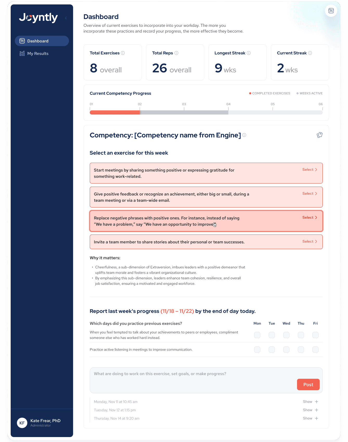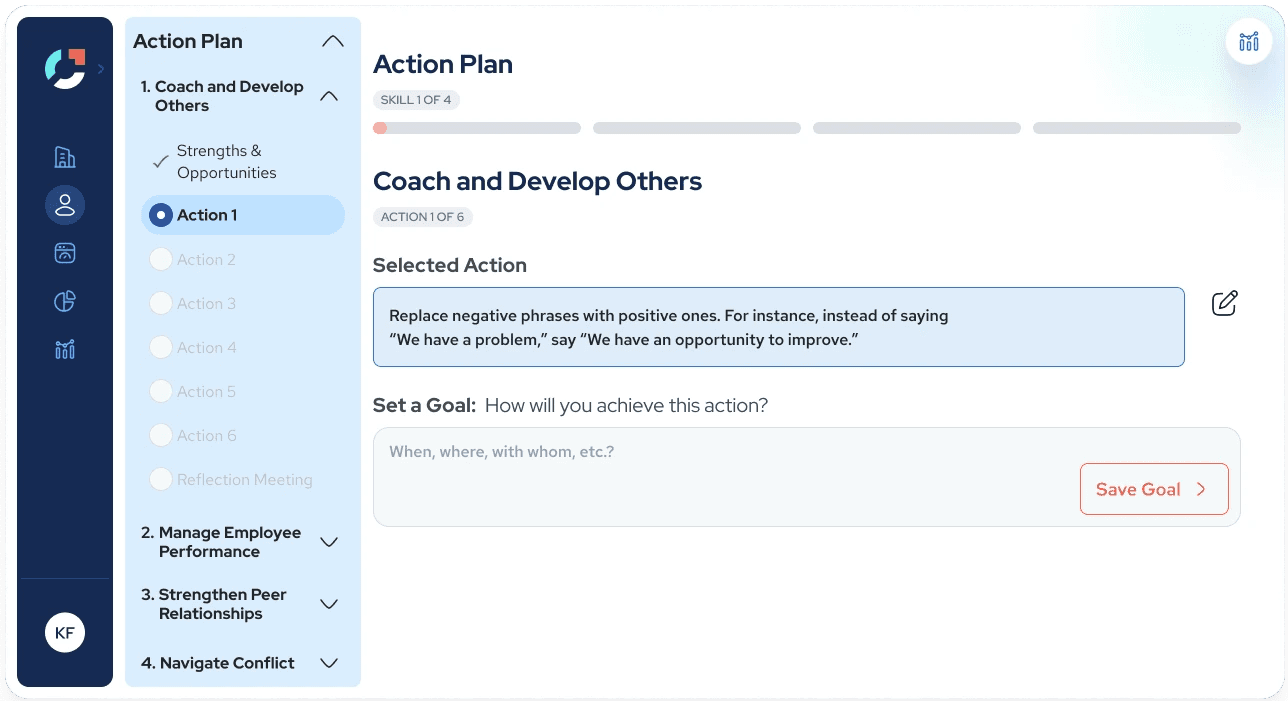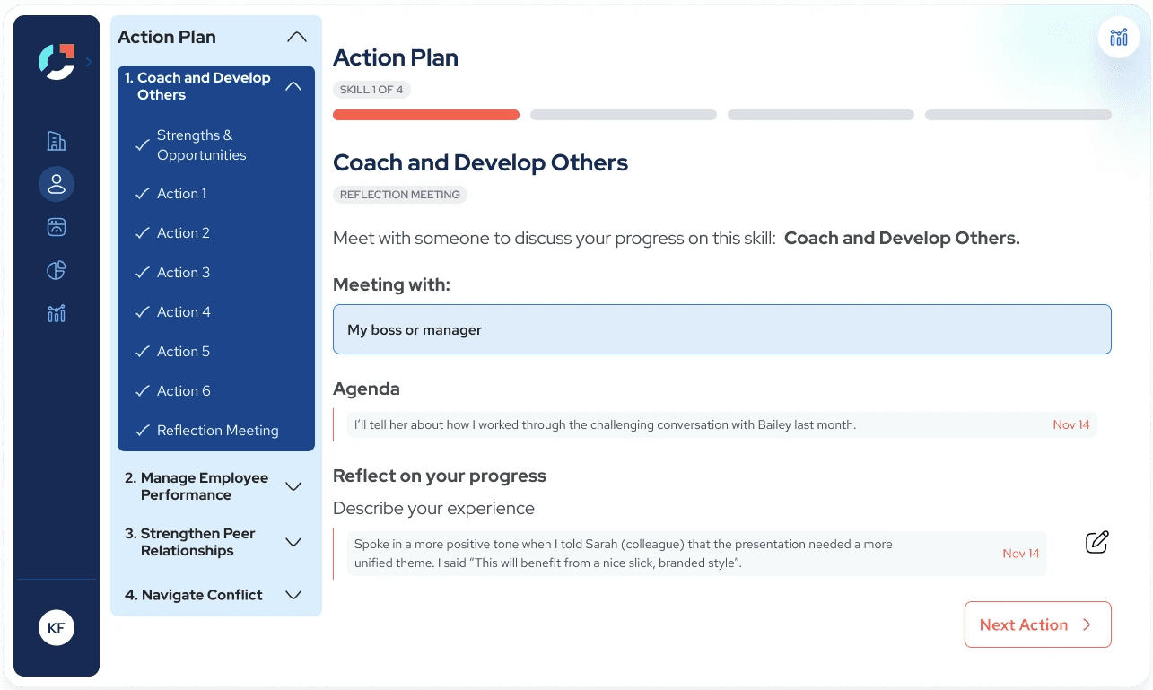 Over the course of this project, I redesigned Joyntly’s post-assessment Action Plan experience from the ground up, rethinking how users move from assessment results into real skill development. The work focused on shifting the experience away from streak-based activity tracking toward a guided, goal-oriented model that supports follow-through in day-to-day work. I led the end-to-end effort, from defining user flows and interaction patterns to building interactive prototypes, identifying usability and accessibility issues, and partnering closely with PMs and engineers to make the redesign build-ready.
